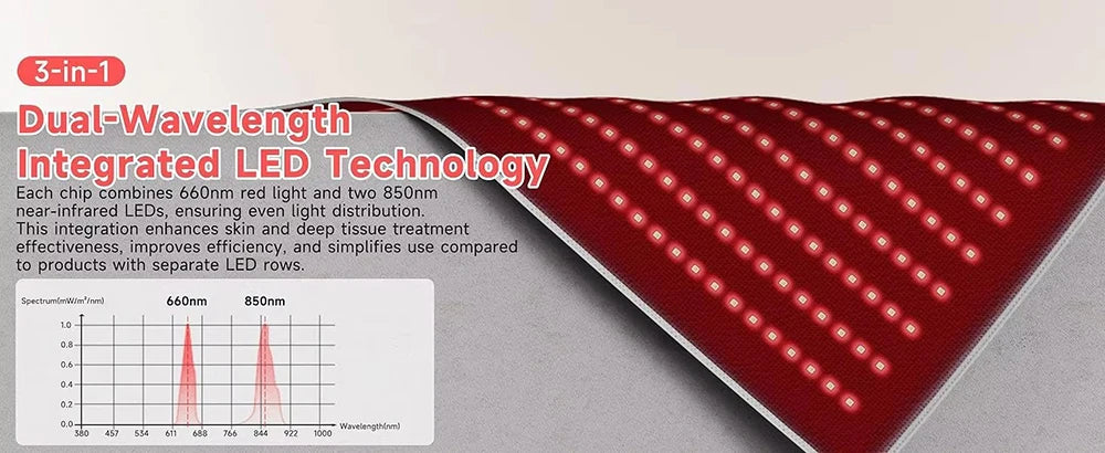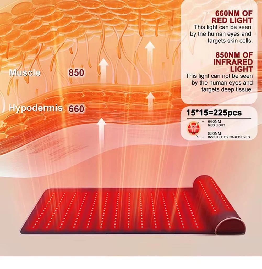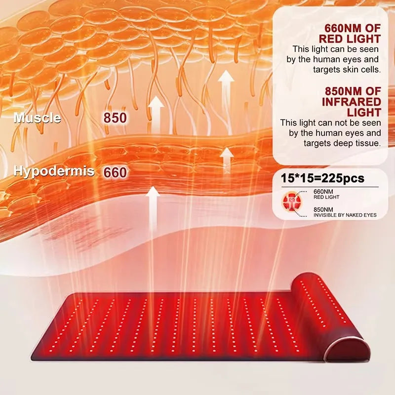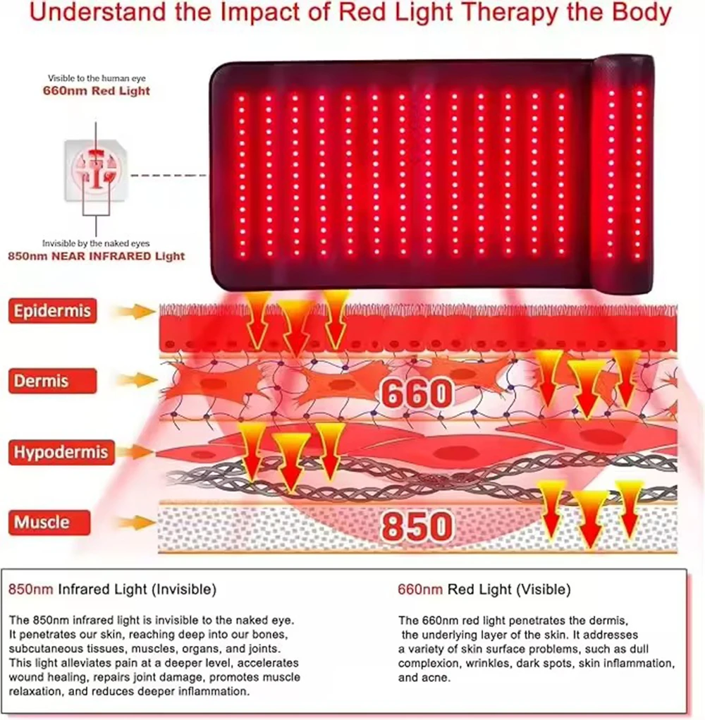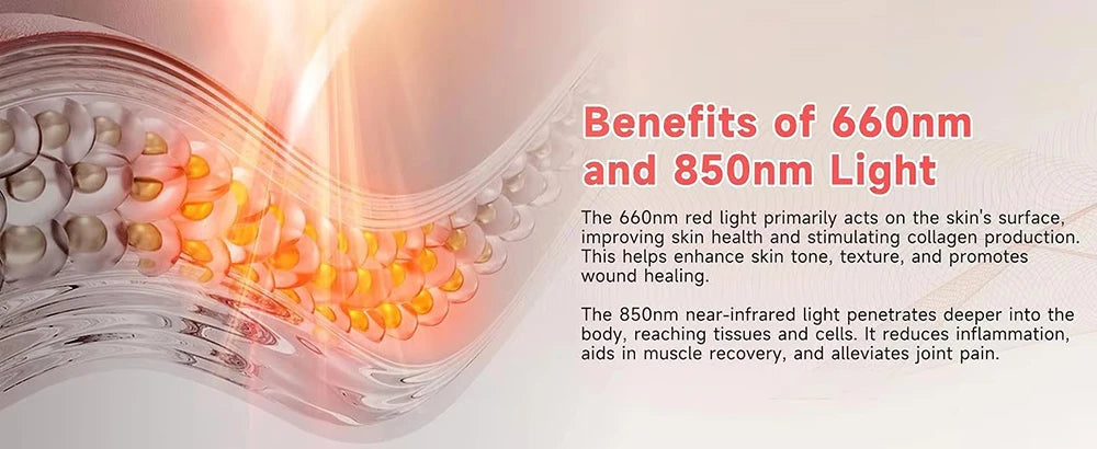The 850nm infrared light is invisible to the naked eye.it penetrates our skin, reaching deep into our bones,subcutaneous tissues, muscles, organs, and joints.This light alleviates pain at a deeper level, accelerateswound healing, repairs joint damage, promotes musclerelaxation, and reduces deeper inflammation.