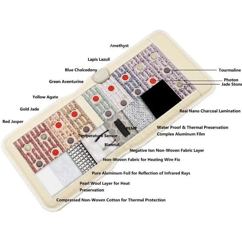 1. Rainbow Crystal: It may be a layer of crystal injected into the cushion (such as amethyst, tourmaline, or jade). These crystals may be heated to release far-infrared radiation, believed to help relax, detoxify, and improve blood circulation.